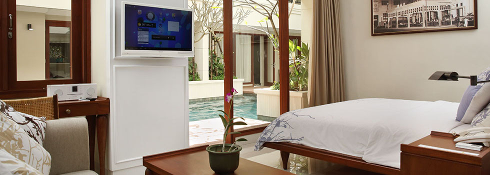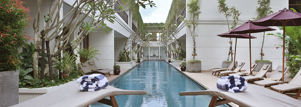 Seminyak Lagoon is a boutique hotel inspired by the elegance of Indonesia’s colonial heritage. It features just 19 tastefully-appointed suites facing a lagoon swimming pool in a design that recreates the intimacy of a small townhouse community. The property is part of a quiet residential neighbourhood in an area that runs behind Sunset Road. It is the perfect place to unwind in style and the boutiques, restaurants, spas and bars of central Seminyak are just a short ride away with our complimentary shuttle service. In-house facilities include a charming 40m swimming pool with a timber deck to soak up the sun. Ground floor suites have direct access to this refreshing body of crystal clear water. There is also a smart dining room, lounge and well-equipped fitness centre. Each suite shows meticulous attention to detail with a look that respects the past yet fully embraces the future. Wrought iron accents and classic sepia photos are balanced by modern amenities such as pure cotton sheets and goose feather pillows for sublime comfort. Seminyak Lagoon comes complete with all the very latest in personal technology. Each suite has its own DVD iPod docking hifi along with an android television for direct internet browsing , games and multimedia options. Favourite movies and music genres can easily be downloaded to enhance overall quality of stay.